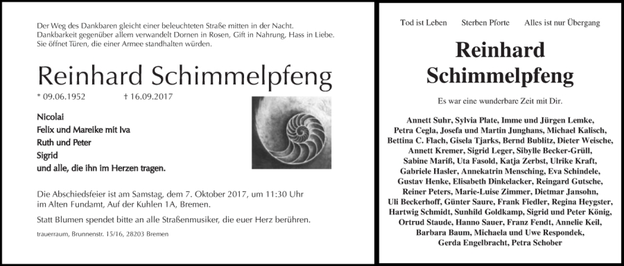 Lieber Reinhard, guter Freund, am 16. September 2017 hast du nach schwerer Krankheit deinen Körper zurück- und losgelassen.